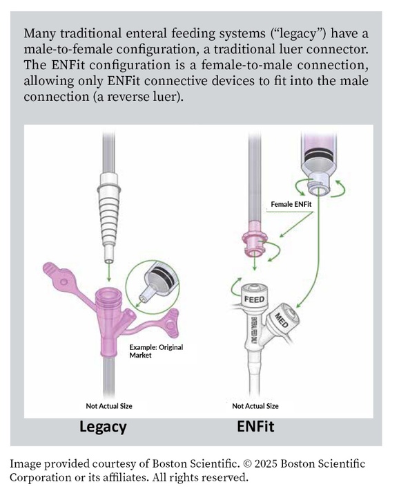 ENfit to Legacy and Legacy (cone/funnel) to ENfit adapters are available often available from your DME supplier or can be purchased online. Plus, cone to ENfit adapters work with catheters as well.